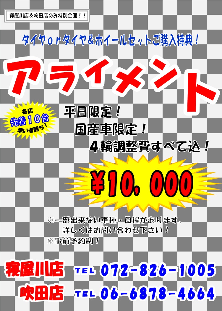 当店にてタイヤ又タイヤ&ホイールセットをご購入のお客様各店先着10台限りアライメント調整一式¥10,000にてさせて頂きます♪現在タイヤが偏摩耗している方や直進の安定性が悪い方・・・etcはアライメントを調整することによってかなり改善されますよ!また、以前アライメント調整したお客様につきましても走行を重ねるうちに足回りがへたってくる為、再度調整する事をオススメ致します。平日限定!国産車限定!(一部出来ないお日にち・車種があります)※詳しくはお問い合わせ下さい!この機会に是非お試し下さいませ〜 (^O^)/