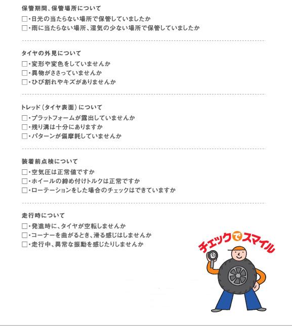 吹田店でもスタッドレスタイヤの早期予約・販売を実施しています。冬に備えて早めの準備が安心でお得です!信頼の国産メーカーをはじめ多数ご用意しています。『いいものをお安く!』させて頂いています!!スタッドレスタイヤをお持ちのお客様はこちらのチェックシートでご確認してはいかがでしょうか?← ← ← 《クリックすると拡大します》いざ装着しようと思った時に使用できない・・・という事も!!シーズン前にぜひご確認してみて下さい!※ご自身で判断が付かない場合はお気軽にご相談下さい。