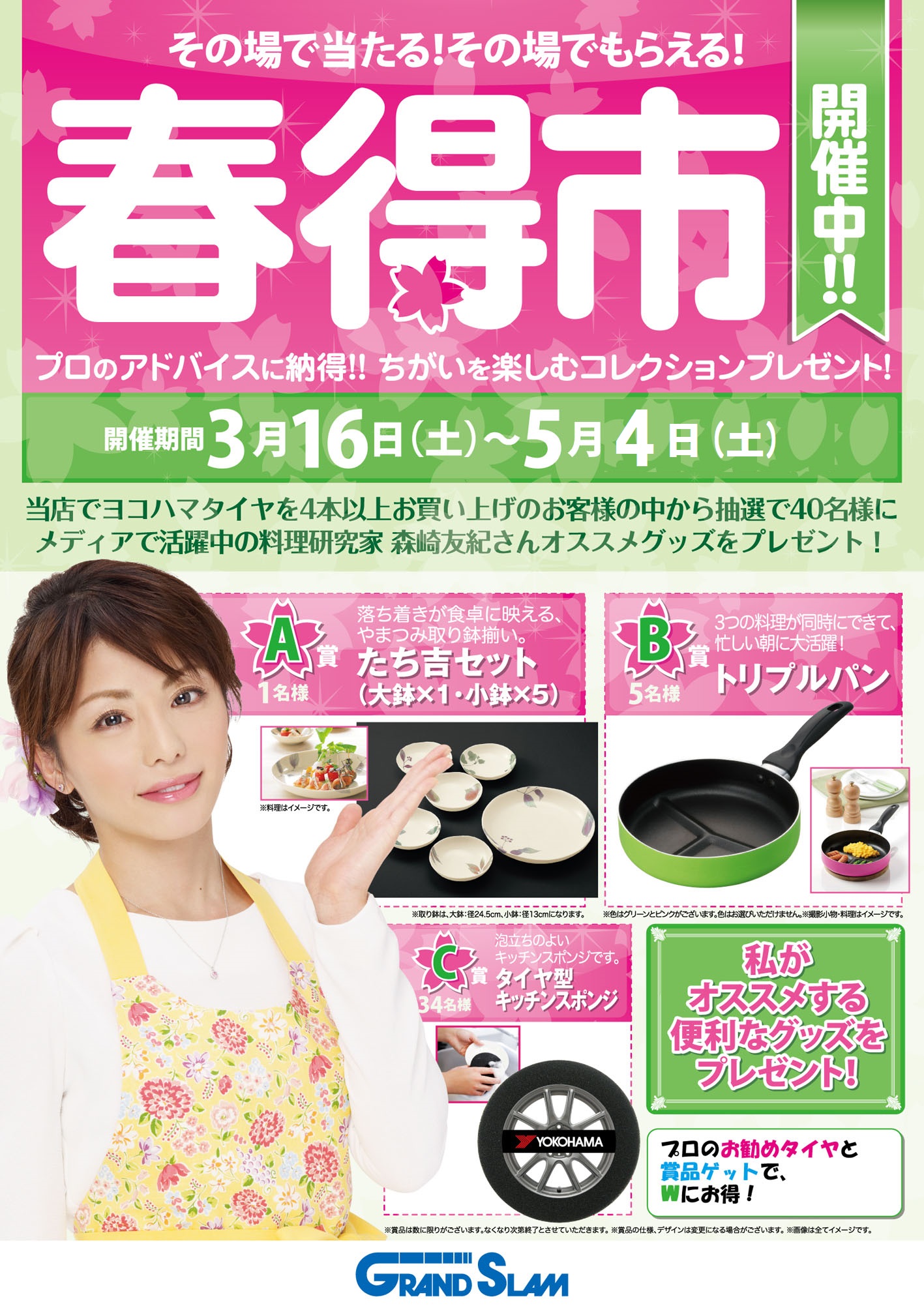 春得市 ■2013年3月16日-5月4日 タイヤを4本お買い上げのお客様の中から抽選で40名様に森崎友紀さんオススメグッズをその場でプレゼント中です!!この機会に是非お買い求めくださいませ。