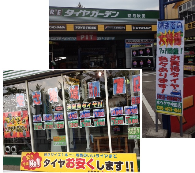 7日(日)〜14日(日)までの8日間『タイヤ総力祭』を開催しています。お買得商品をはじめキャッシュバックやプレゼント・・・かなりお得になっています\(^v^)/さ・ら・に♪これまでのタイヤ販売価格を見直し、さらにさらにお買い求めやすくなりました!タイヤ購入のお客様は是非この機会にご来店下さい!!お待ちしていま〜す☆彡タイヤガーデンHOGETSU 吹田店〒565-0803 大阪府吹田市青葉丘南3-55 TEL:06-6878-4664 FAX:06-6878-4404 営業時間 AM10:00〜PM8:00 (日・祝祭日はPM7:00) 定休日 火曜日